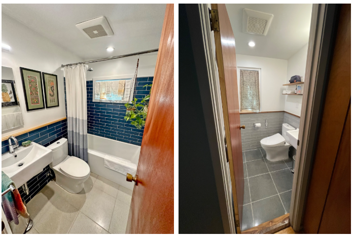 Another repeat client, we updated both bathrooms in this 1964 Midcentury gem back in 2022. While completely modernized, both bathrooms still reference the home’s original era with terrazzo floor tile, wall tile and wood details on the trim and shelving.