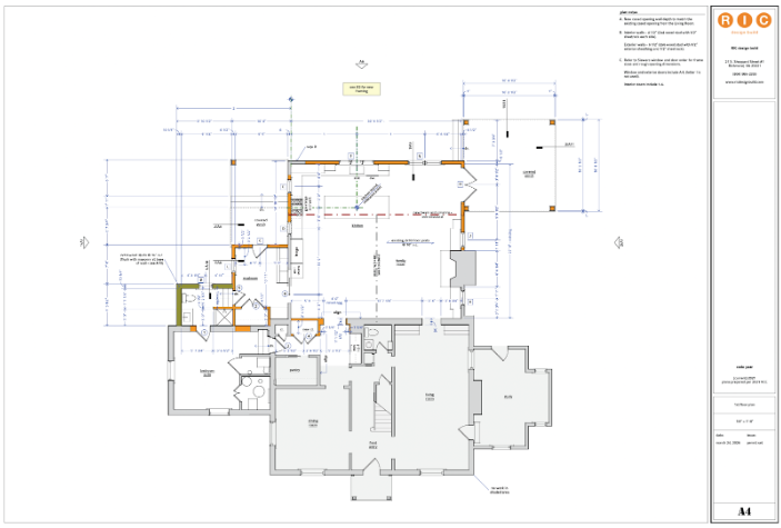In the floor plans below you’ll see the original layout in gray, with the new work along the back of the house in orange and green. It’s going to be a major expansion that will nearly double the square footage of the first floor.