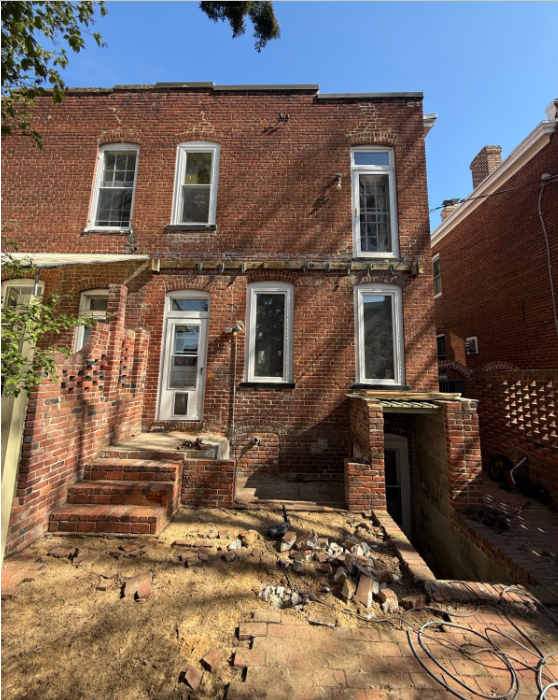 This Fan rowhouse was not living up to its exterior’s potential with a small, rotting back deck. In this picture we’ve completed demolition of the old deck, uncovering the remnants of an old brick stoop that was underneath.