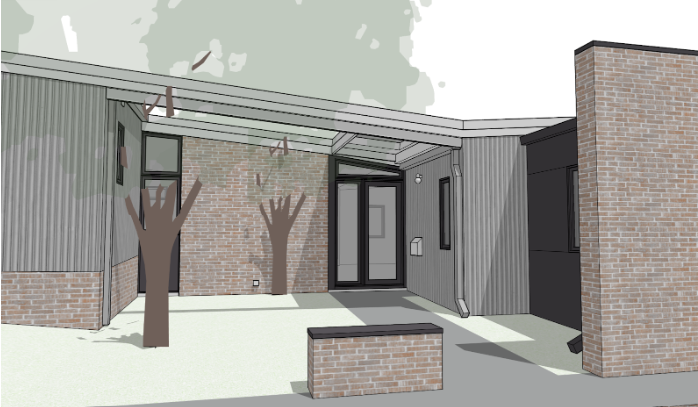 Our rendering of the project shows the single story addition along the back of the house that will include a new kitchen, expanded mudroom, first floor bedroom suite and a covered patio.